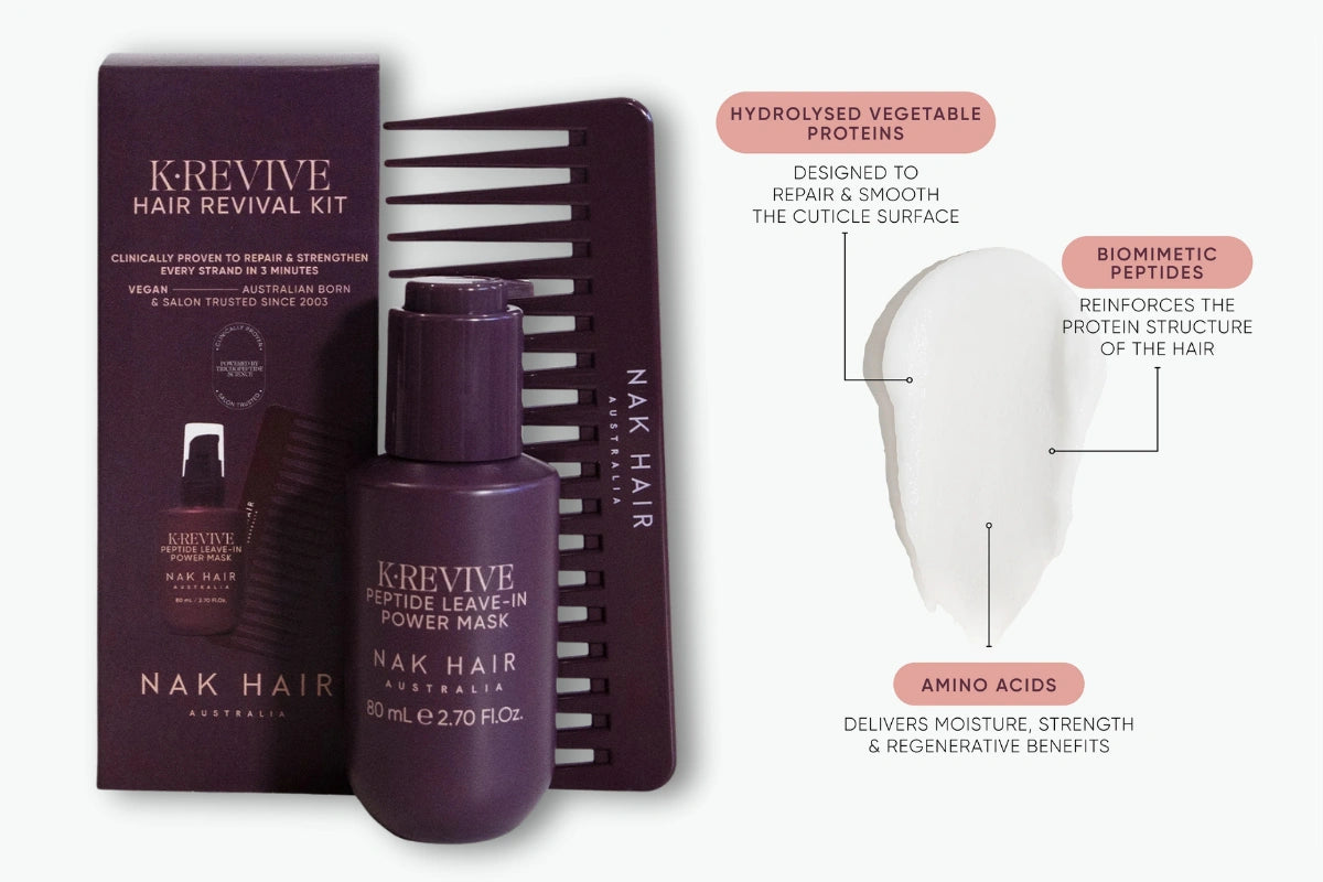 The K-REVIVE Hair Revival Kit pairs Nak's crowd-favourite K-REVIVE Peptide Leave-In Power Mask with a sleek, detangling comb designed to evenly distribute product from root to tip. This restorative duo works to reduce breakage, smooth frizz, boost shine and replenish moisture — leaving hair soft, silky and visibly revived.
