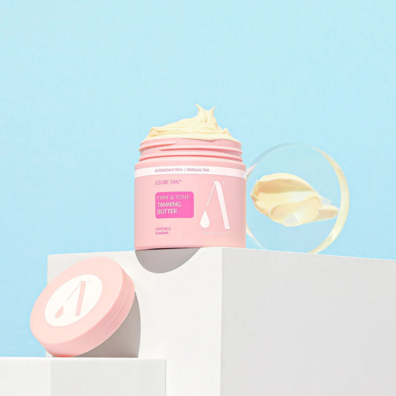 Indulge in a luxurious tanning experience with Azure Tan Firm & Tone Tanning Butter. This rich, fast-absorbing formula melts into your skin, building a gradual glow while helping to firm and tone. Infused with guarana and caffeine to boost circulation, plus shea butter to lock in moisture, it leaves skin feeling soft, smooth, and radiant