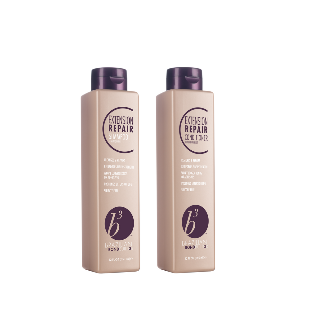 Brazilian Bond Builder Extension Repair Duo is a multi-active pair that repairs signs of damage to natural and extension hair to help maintain a seamless look and prolong extension life.