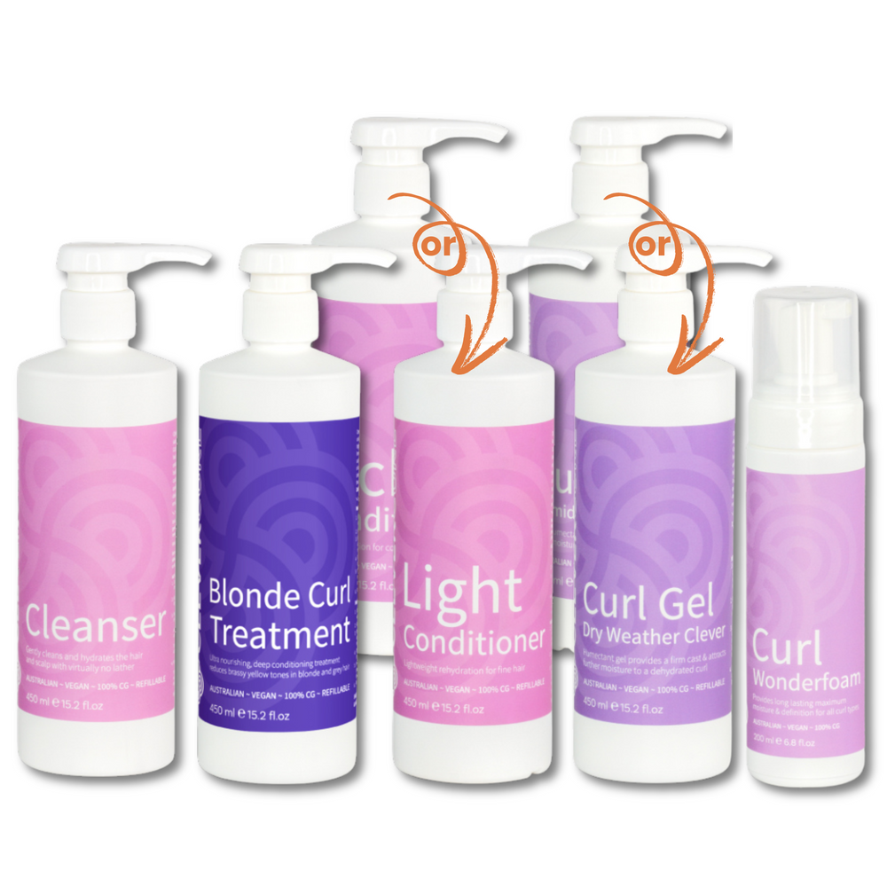 Meet the ultimate in personalised curl care – the Clever Curl Blonde Ultimate Bundle. Created for naturally curly, wavy, or coily hair that’s been lightened or coloured blonde, this 5-piece system empowers you to build a routine that adapts to your hair’s unique moisture needs and your local climate. Whether you’re braving humid coastal mornings or dry inland winds, this set gives your curls the hydration, toning, and definition they deserve – no crunch, no frizz, no compromise.